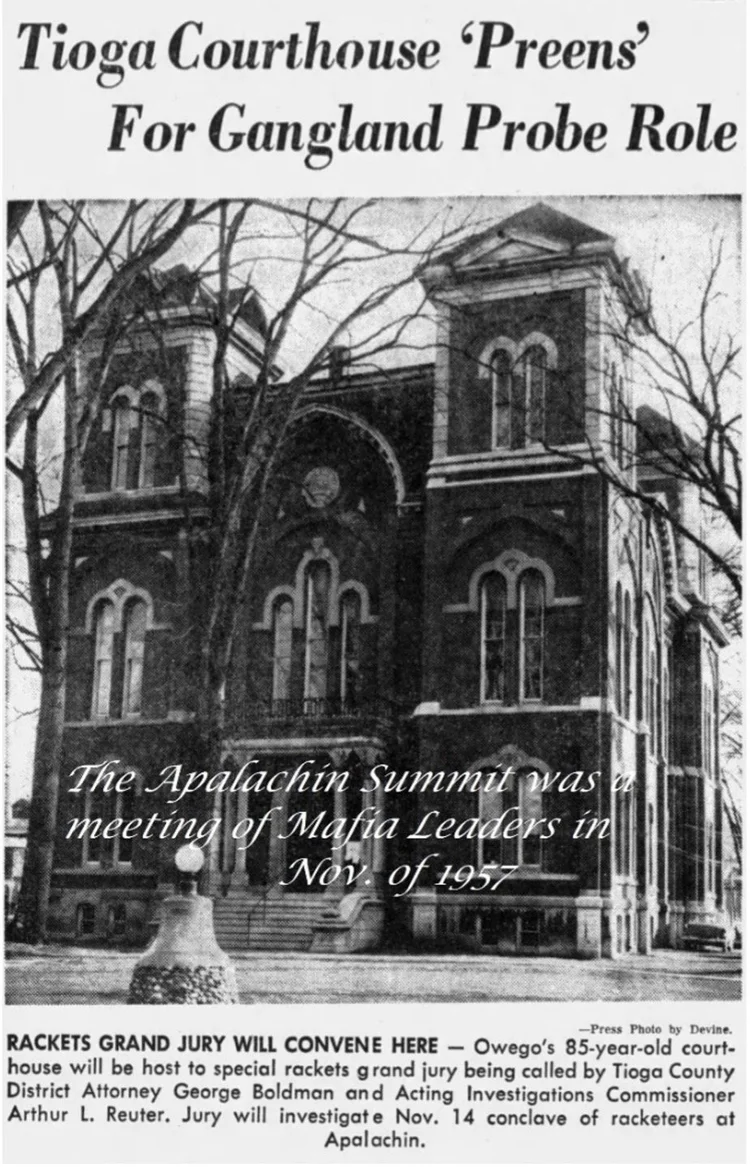 Apalachin: Derived from the township name of Apalacon, Pa., in Susquehanna County, where the Apalachin Creek originates. The name is Indian in Origin and signifies, "from whence the messenger returned." Although Isaac Harris, the first settler, settled here in 1786 from Rhode Island, Apalachin was established in 1836.